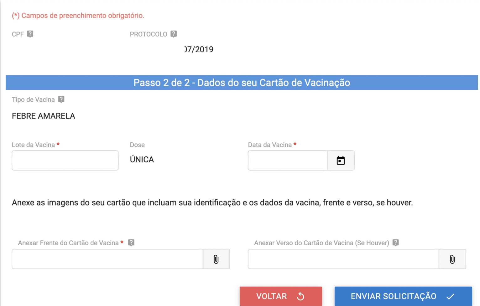 É obrigatório informar qual o lote da vacina e em qual data foi tomada a dose única. Depois é só anexar imagens frente e verso do comprovante da vacina.