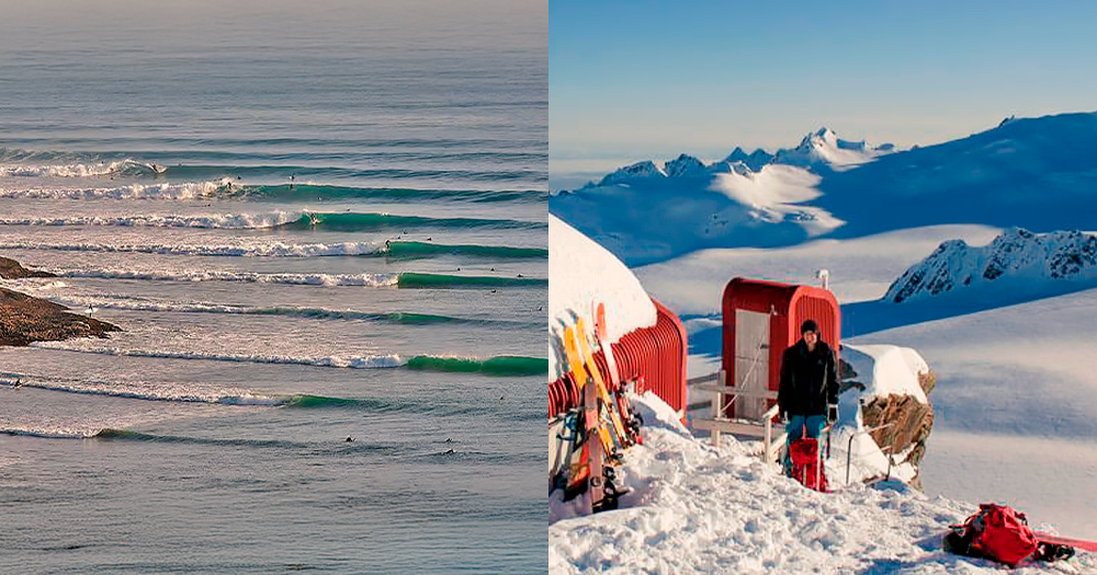 📍Imagem:De um lado, a imagem revela Shipwreck Bay, na Ilha Norte da Nova Zelândia. Conhecida por suas longas ondas esquerdas e pela paisagem intocada, essa praia é um verdadeiro paraíso para surfistas e amantes da natureza. Mais do que um pico de surfe de renome, Shipwreck Bay entrou para a história como cenário do clássico filme The Endless Summer (Verão Sem Fim), de Bruce Brown, um marco do cinema de surfe. Do outro lado, a cena muda completamente com os Alpes do Sul, na Ilha Sul. Essa cadeia montanhosa abriga algumas das maiores altitudes do país, com paisagens cobertas de neve, geleiras ativas e refúgios isolados como o retratado na imagem, próximo a Queenstown. É um dos principais destinos para esportes de inverno na Nova Zelândia, ideal para quem busca aventura com esqui de travessia ou montanhismo em cenários de tirar o fôlego.